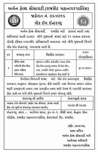 Posts Name : Female Health Worker / A.N.M.Qualification : F.H.W. or A.N.M. Pass (Nursing Course)Salary : Rs. 11,000/- (fix)Interview Date : Every Monday of the MonthInterview Time : 4:00pm to 6:00pmInterview Place : Health Branch, Room No. 1, 3rd Floor, Central Zone Office, Rajkot Municipal Corporation, Debarbhai Road, Road, Rajkot.